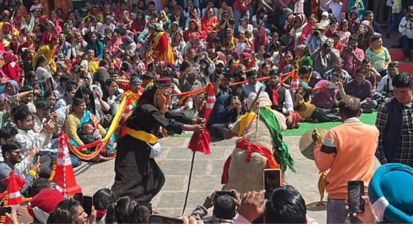 रम्माण मेले में ढोल-दमांऊ की थाप पर नृत्य करते हुए